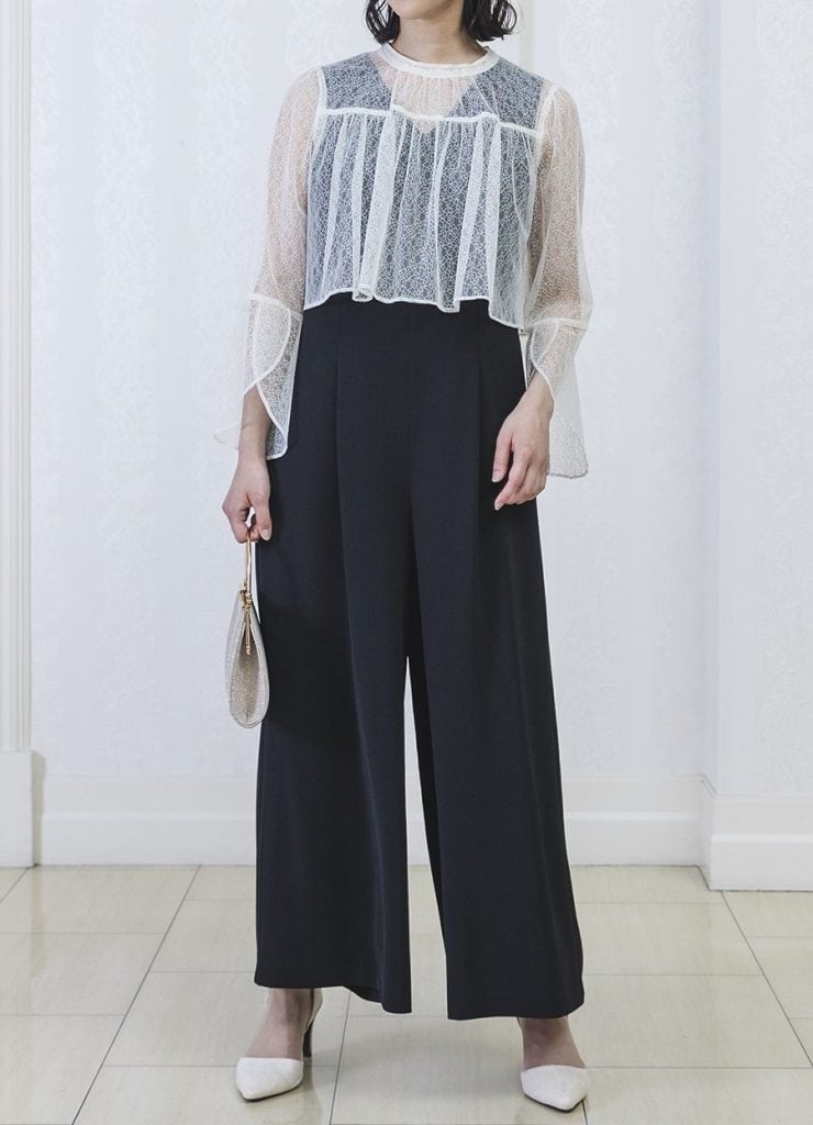 パンツドレスは、「オールインワン」や「セットアップ」など、上下が揃ったデザインを選ぶとよりドレスアップした印象に。