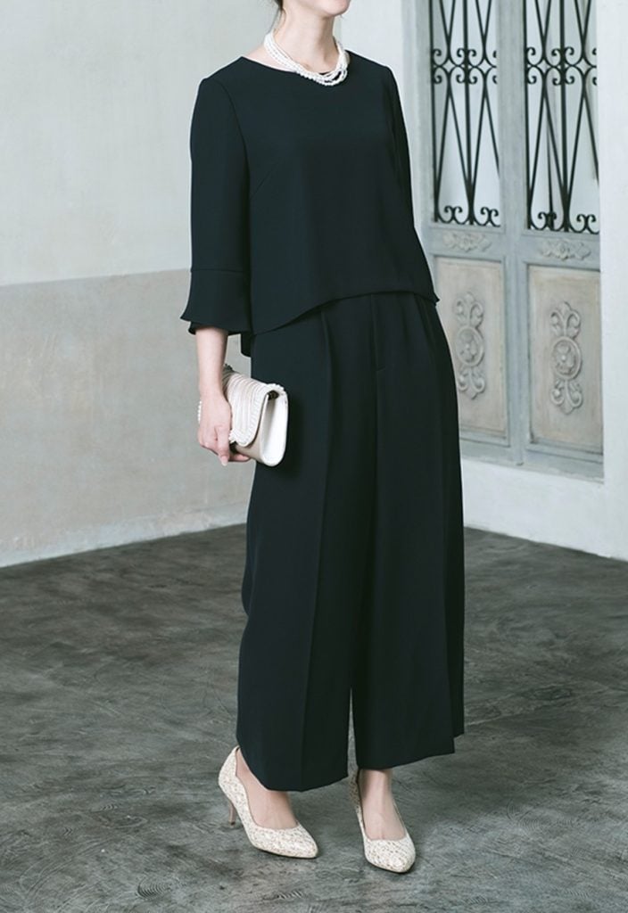 パンツスタイルはワンピースタイプよりもカジュアルに見えやすいことがあるため、フォーマルなトップスを選ぶのがおすすめ。背中の大きく開いたデザインなどは避け、袖付きやレースをあしらったものなど、品よく肌を覆うデザインがぴったりです。