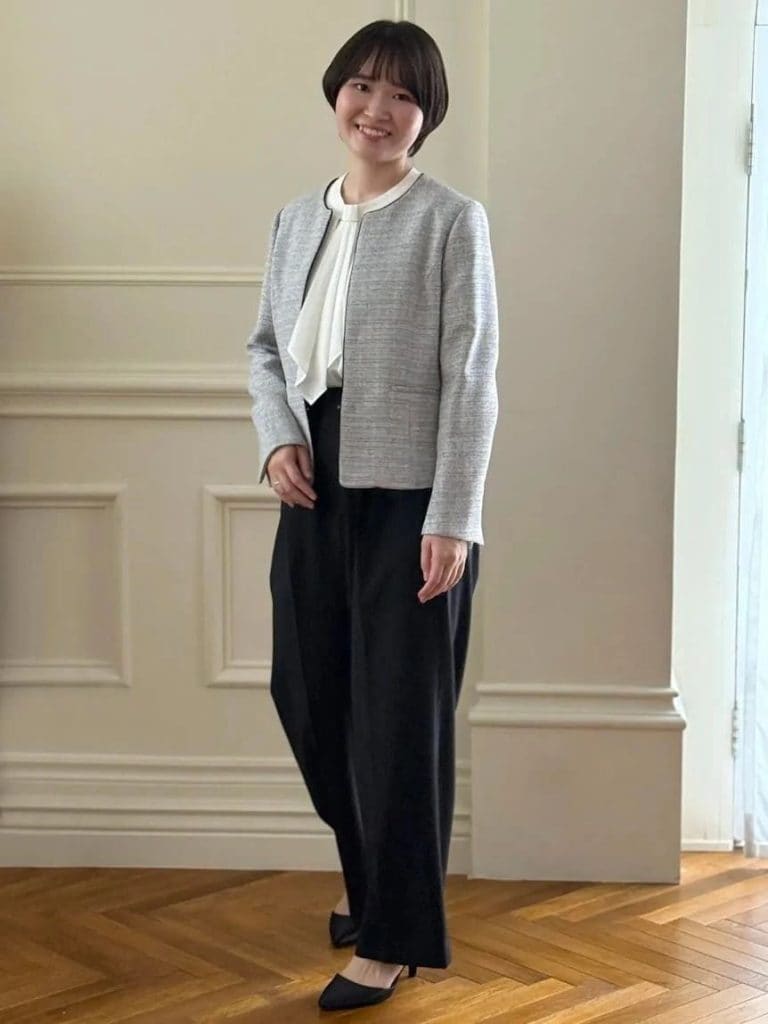 フォーマルな着こなしに上品な抜け感をプラスするなら、ノーカラージャケット×ワイドパンツの組み合わせがおすすめ。