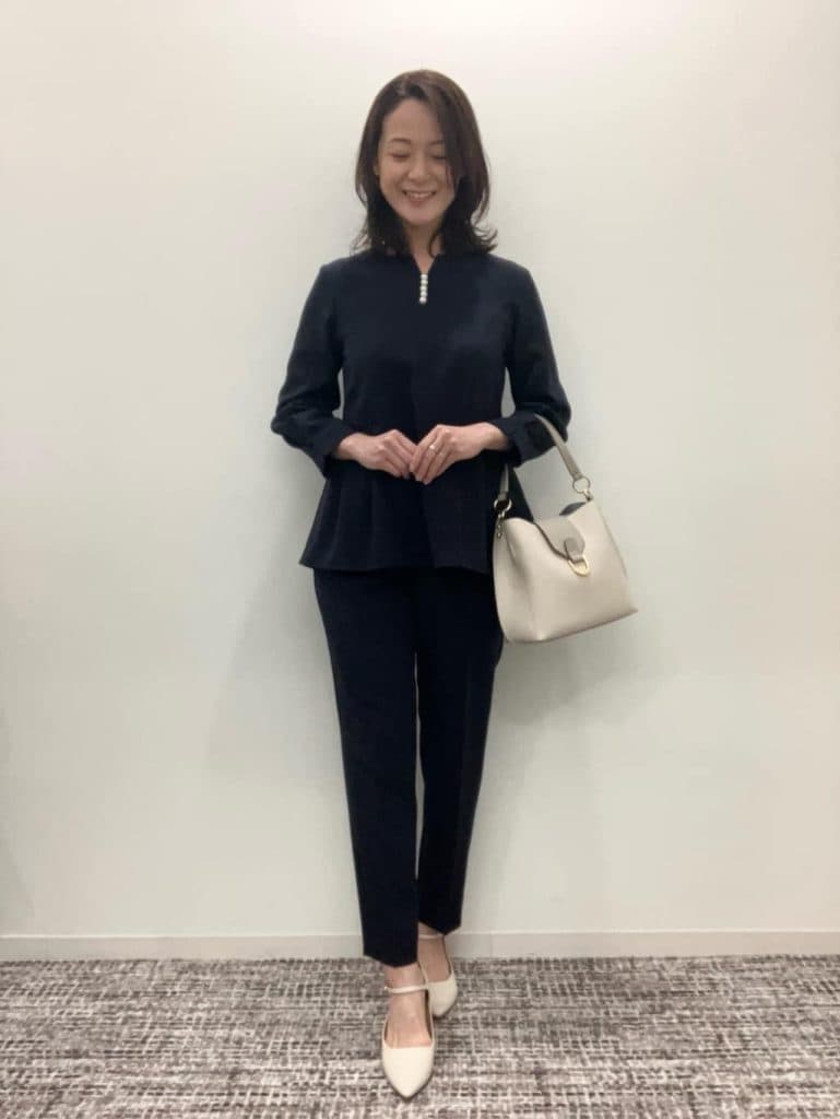 ネイビーやチャコールグレーなど、落ち着いたカラーでまとめれば、きちんと感も華やかさも両立できます。足元はパンプスで引き締めて、アクセサリーで上品に華を添えるのがポイント。