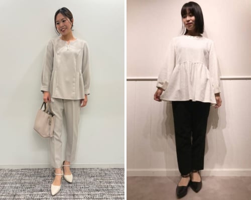 ペプラムトップス付きのセットアップやウエストマークできるデザインなら、スタイルアップ効果も期待できます。