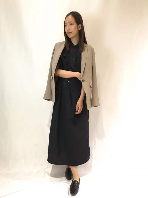 ベージュのテーラードジャケットは、ワンピースとの相性もばっちり。シンプルで落ち着いた色合いのワンピースを選べば、ジャケットを羽織るだけでフォーマルな印象に。