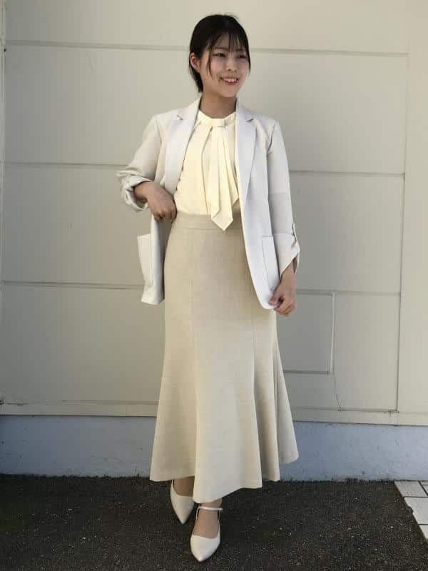 ソフトブラウスのアクセサリーやボウタイは取り外し可能なので、お好みのスタイリングで着こなせるのがうれしいポイント。ベージュジャケットを羽織ることで「きちんと感」もアップします。