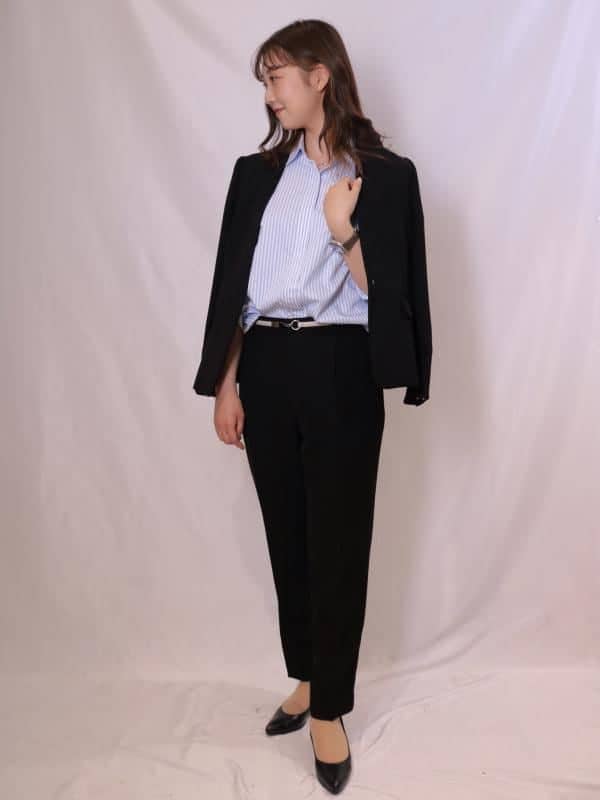 黒のセットアップのインナーにストライプシャツを合わせることで、堅苦しさを軽減しながら、きちんと感も演出できます。ON・OFFどちらでも活躍できるスタイルなので、1枚持っておくと便利に着回せます。