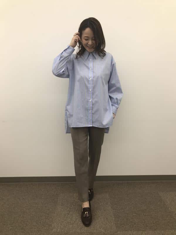 細身のパンツと合わせれば、シルエットもすっきりとまとまり、オフィスでも浮かないコーデに。足元はパンツの色味に合わせて、ブラウンのローファーでまとめています。