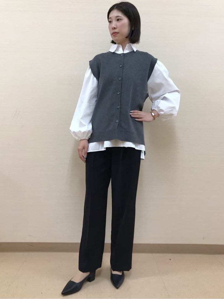ベストは短め丈で重心が上がり、脚長効果も期待できます。シャツの裾を少し見せることで、抜け感と軽さをプラスしました。