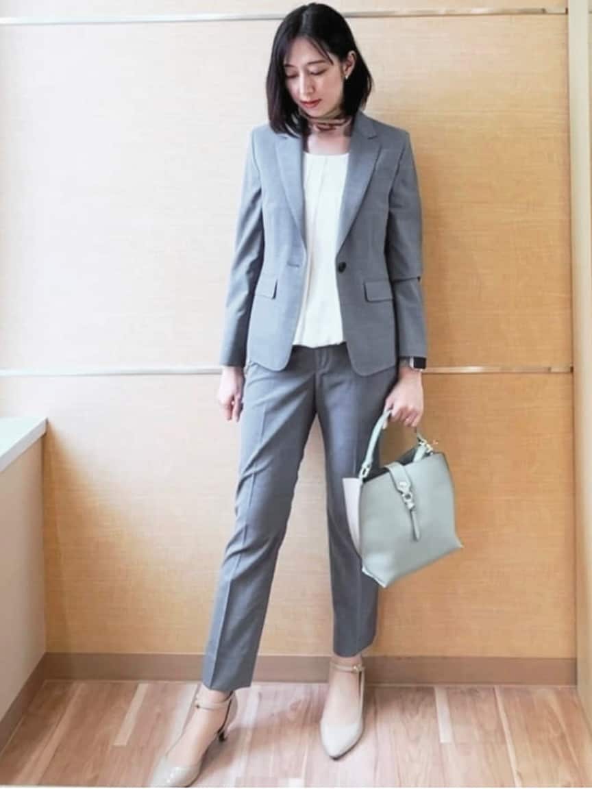 1つボタンのスーツは、ウエストが高めの位置で絞られているため、スタイルがよく見えるのが特徴。シルエットがすっきりしていて、女性らしいラインを引き立てたいときにおすすめです。