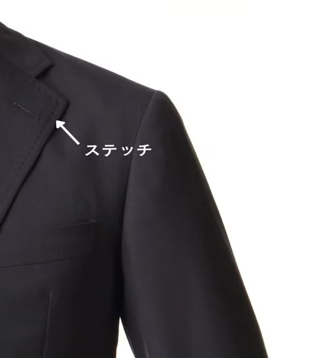 AMFステッチとは、スーツの襟やラペル、ポケット周りなどに施される、細かい飾り縫いのことを指します。ステッチが入ることで、スーツ全体の高級感がアップし、よりシャープでエレガントな雰囲気を演出します。細かいステッチの美しさは、オーダースーツならではの魅力といえるでしょう。