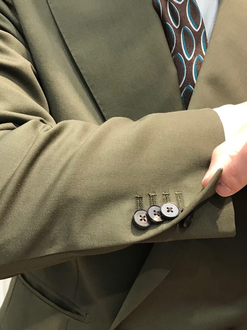一般的なスーツのボタンは、プラスチックや貝ボタンが使われることが多いですが、オーダースーツなら素材の選択肢が広がります。高級感を演出したいなら、ナットボタンがおすすめです。ナットは木の実の一種で、独特の風合いと深みのある色合いが特徴です。スーツの袖口に上品なアクセントを加えられます。