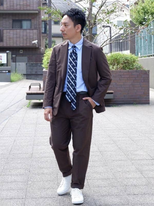 スーツやジャケットに合わせても堅すぎず、程よいカジュアル感を演出できるのが魅力です。シャツはボタンダウンタイプを選ぶことで襟元がきれいにキープされ、Vゾーンが自然とまとまります。足元はスニーカーを合わせて抜け感を出せば、ビジネスからオフスタイルまで幅広く対応可能。きちんと感とリラックス感を両立したい方におすすめです。