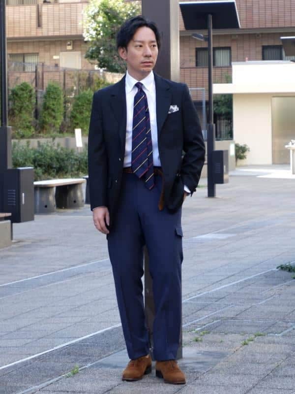 ネイビーブレザーとボタンダウンのオックスフォードシャツを合わせた、清潔感あふれるコーディネートです。シンプルな組み合わせながら、レジメンタルタイやドレスカーゴパンツなどでさりげないこだわりをプラスしました。