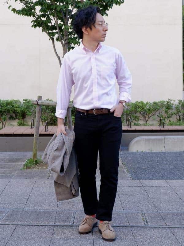ライトカラーのオックスフォードシャツを、ブラックデニムやチノパンと合わせるカジュアルコーデ。シャツのきちんと感とデニムのラフさが絶妙にマッチして、休日やオフィスカジュアルにも対応できます。