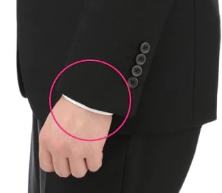 腕を下ろした状態で、ジャケットの袖丈は手首が隠れる程度の長さが目安です。さらに、ワイシャツの袖丈は、ジャケットの袖口から1cm〜1.5㎝ほど見えているのが理想の着こなしです。