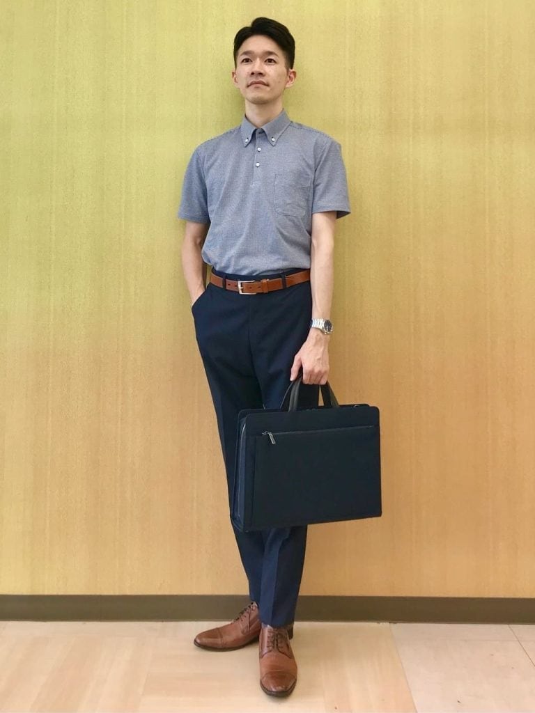 シャツ1枚でもすっきりとしたコーディネートになり、ビジネスシーンにおすすめの装いです。