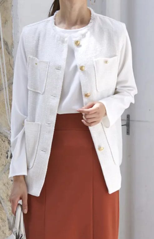 「パキッとした白のジレはハードルが高い……」という方におすすめなのが、穏やかなベージュカラー(白系)のジレです。テーラードジレとタイトスカートのセットアップで、上品なIラインシルエットに仕上げています。インナーやパンプスにも白系の色を合わせると、上品なワントーンコーデの完成です。
