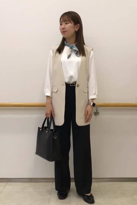 ジャストサイズのシンプルなシャツ・ブラウスに白ジレを合わせると、すっきりとしたフォーマルコーデが完成します。