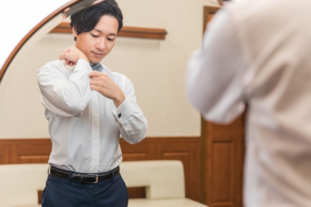 結婚式や披露宴ではフォーマルな装いが求められるため、ウイングカラーシャツは適したシャツのひとつです。