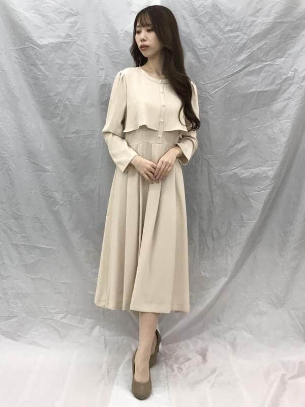 華やかなベージュのワンピースは、結婚式のお呼ばれコーデに最適です。ウエストの切り替え位置が高いため、脚長効果も期待できます。エレガントで上品なシルエットですが、スカートのフレアが深いため、動いたときには可愛らしさも漂わせることができます。