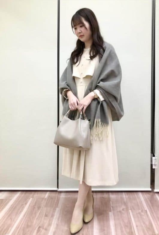 グレージュの色違いワンピースなら、柔らかで可憐な雰囲気が漂います。ホワイトのコンパクトなバッグと合わせれば、抜け感のあるコーデに仕上がるでしょう。結婚式だけでなく入園式・入学式でも着回しできます。