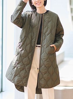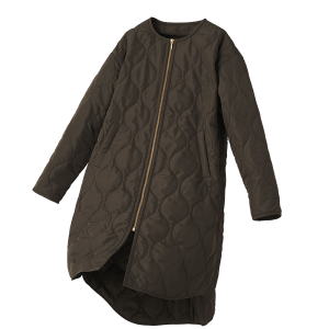 昨年大人気のひょうたんキルトコートを今旬デザインとカラーにアップグレードし新登場。カジュアルにもシックにも魅せるキルティングデザインで、通勤服にも休日のお出かけ服にも相性抜群。サイドには大きなスリットをあしらい体型カバーと動きやすさを両立。