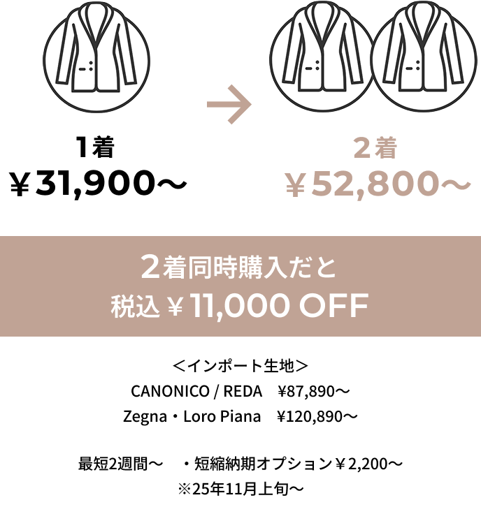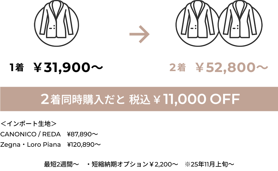 本格オーダースーツがお求めやすい価格で。オーダーメイド工程のスマート化と、生地の圧倒的な仕入量で、ハイクオリティでありながら低価格を実現しました。