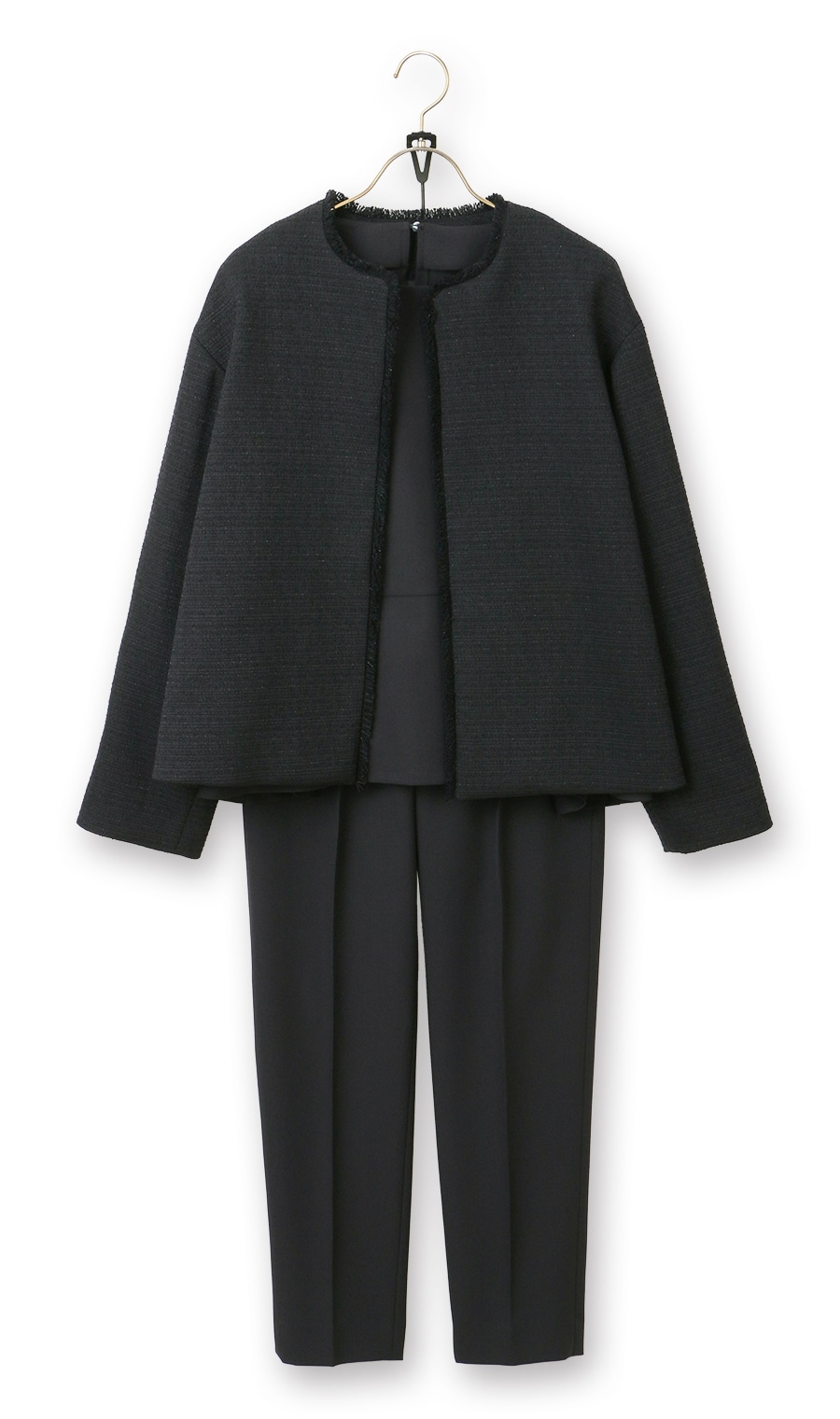 Vカラージャケット・プルオーバーブラウス・ストレートパンツの3点セット。ナチュラルストレッチで適度なハリコシ感のある国内濃染フォーマル生地を使用しました。