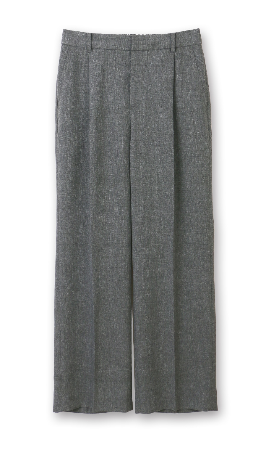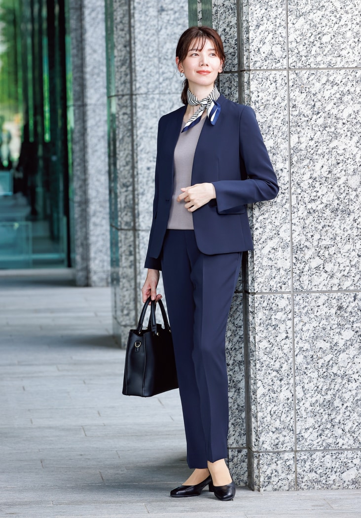 パンツスタイルで動きやすいビジネスシーンの装いに。インナーにニットを合わせて重すぎず軽やかな印象に。