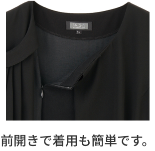 顔周りをスッキリと見せてくれる綺麗なシルエットのジャケットに、適度な透け感のあるシフォン素材を使用したブラウス風の軽いタッチの前開きワンピースがセットされたアンサンブルです。