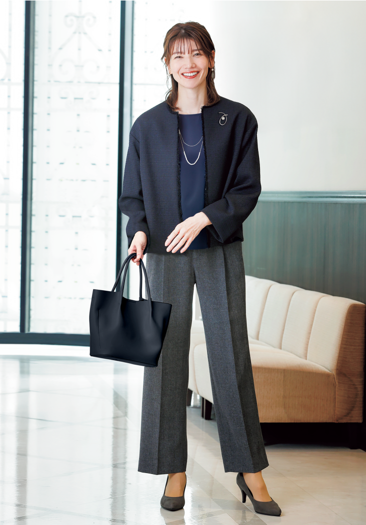 ノーカラージャケットは表情のあるツイード素材で立体感を演出。ネイビーのシンプルなカラーのアンサンブルでビジネスにも合わせやすい。