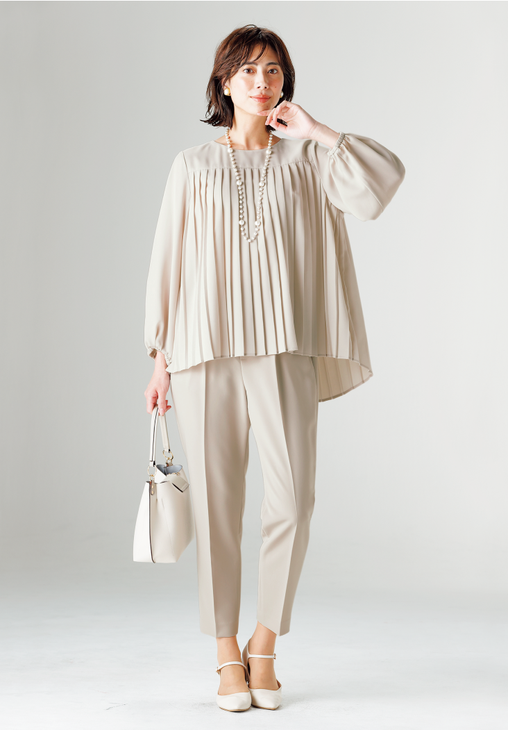 どこから見てもサマになるプリーツブラウスとストレッチ性のある美脚テーパードパンツ。ウォッシャブル仕様で自宅で手軽に洗濯できます。
