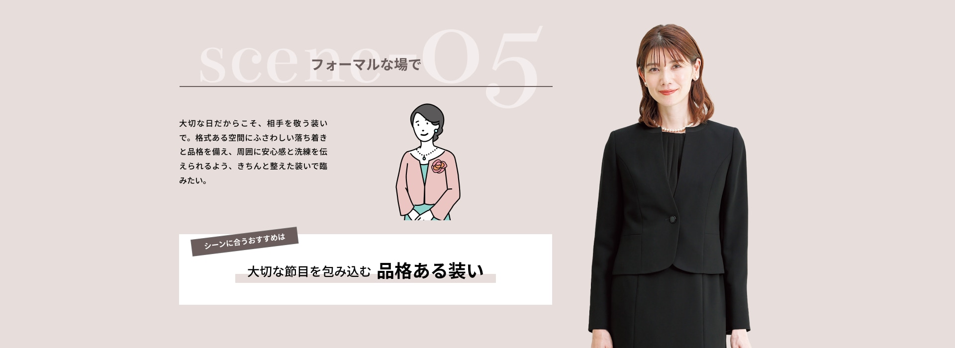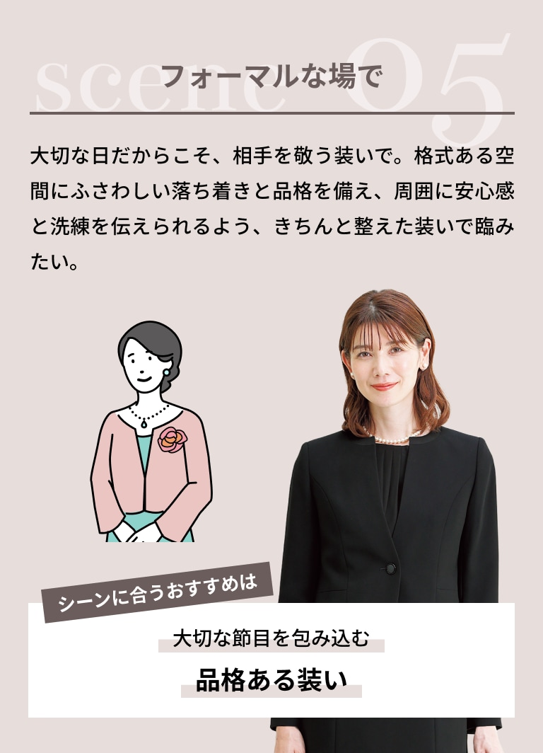 敬いと偲ぶ心を表現するブラックフォーマルや、結婚式やパーティ、入学式など、品格が求められるセレモニーフォーマル。