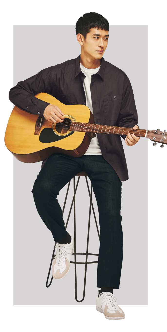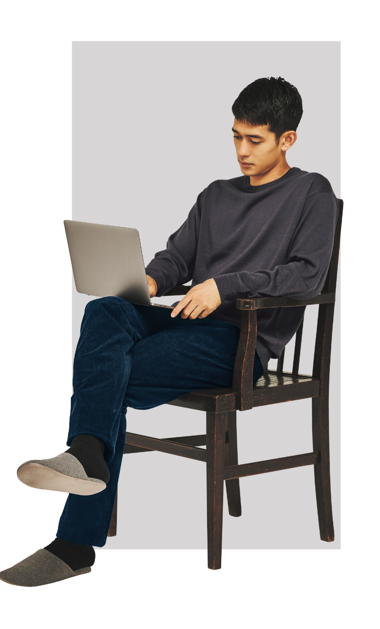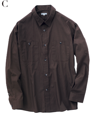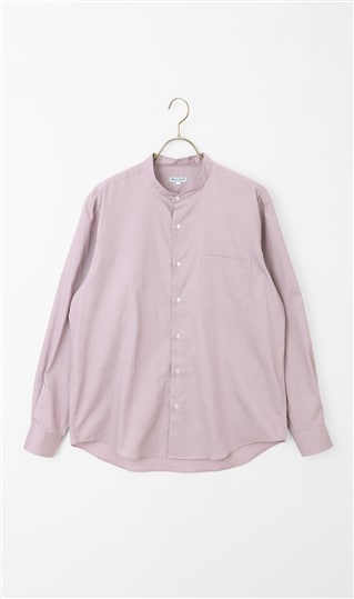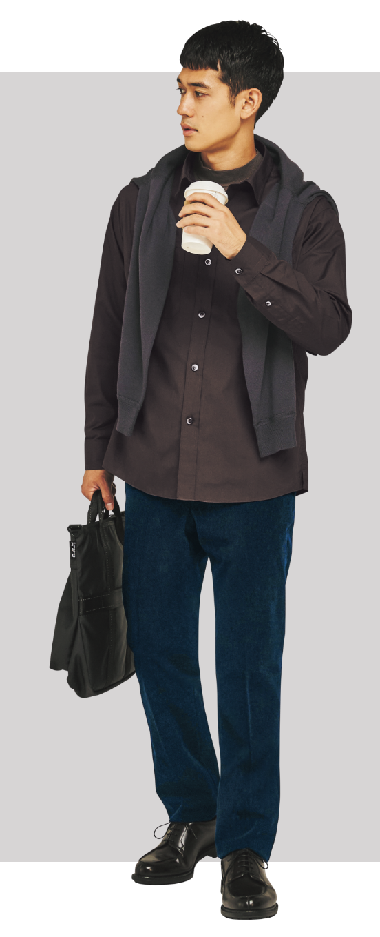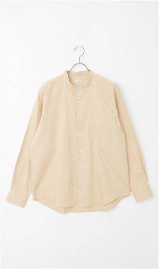 きっちり見える&抜け感のあるバンドカラーシャツは万能。さらっとした着心地で快適に過ごせる、在宅ワークに最適なスタイル。リラックスしながらも仕事モードに切り替えやすい着こなしで、オンライン会議でも好印象をキープ。