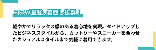 他にもブラックパンツで引き締めたり、ジャケットの代わりにカーディガンを羽織ったりと、適度な「きちんと感」を取り入れたビジネスカジュアルがおすすめです。