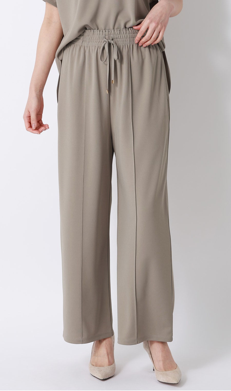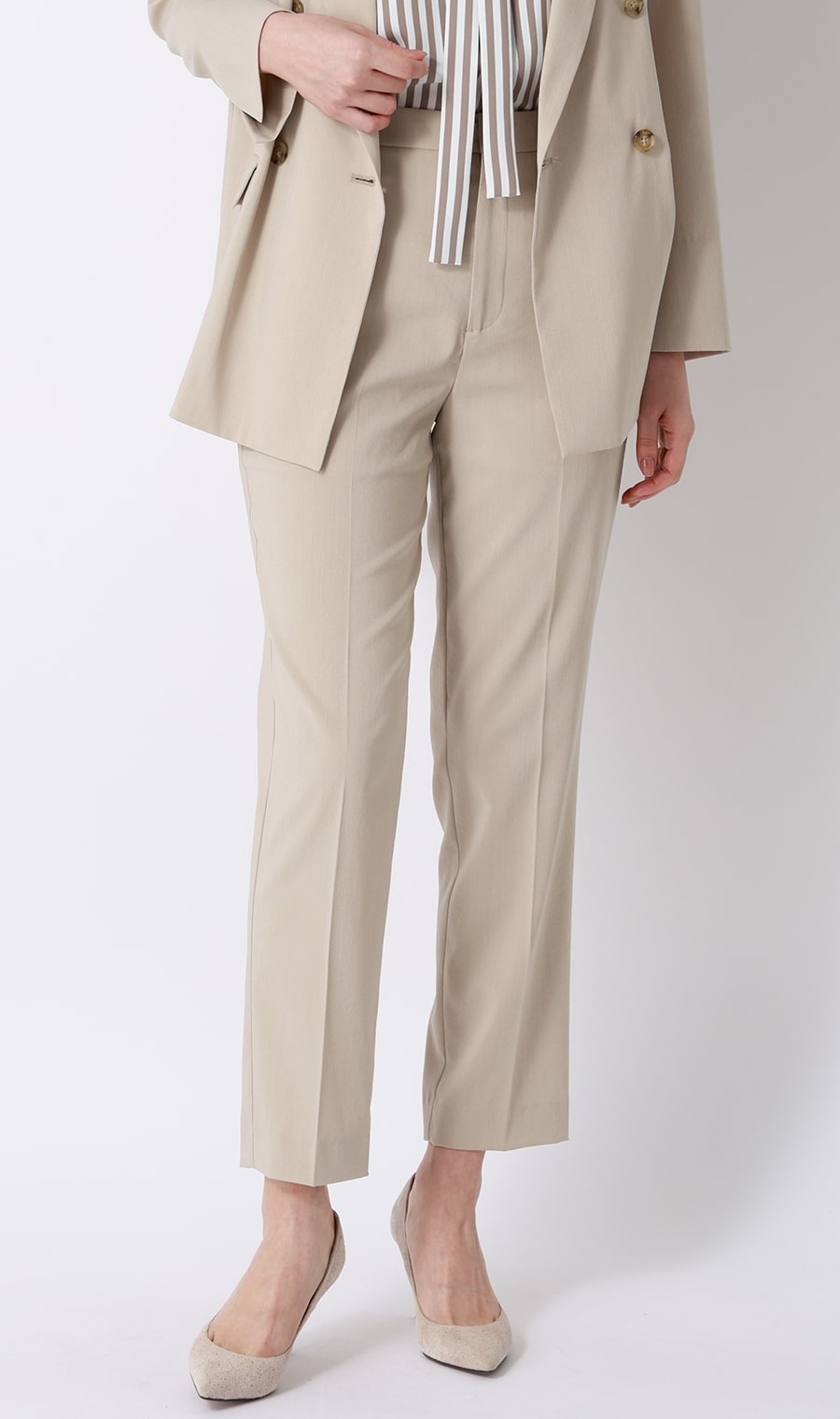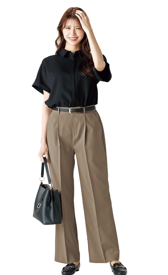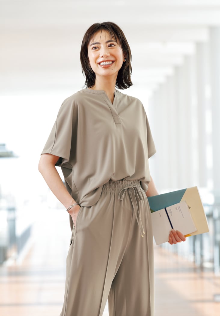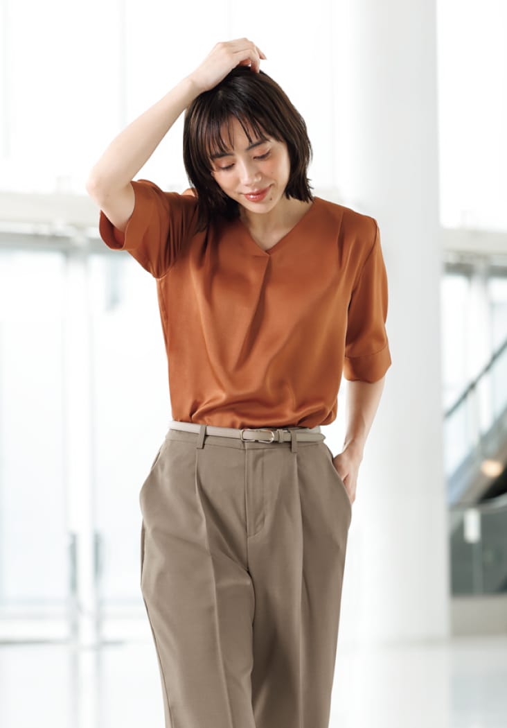 セットアップならではのきちんと感を演出。ブラウス、パンツだけでも着回ししやすい、長い夏の強い味方です。