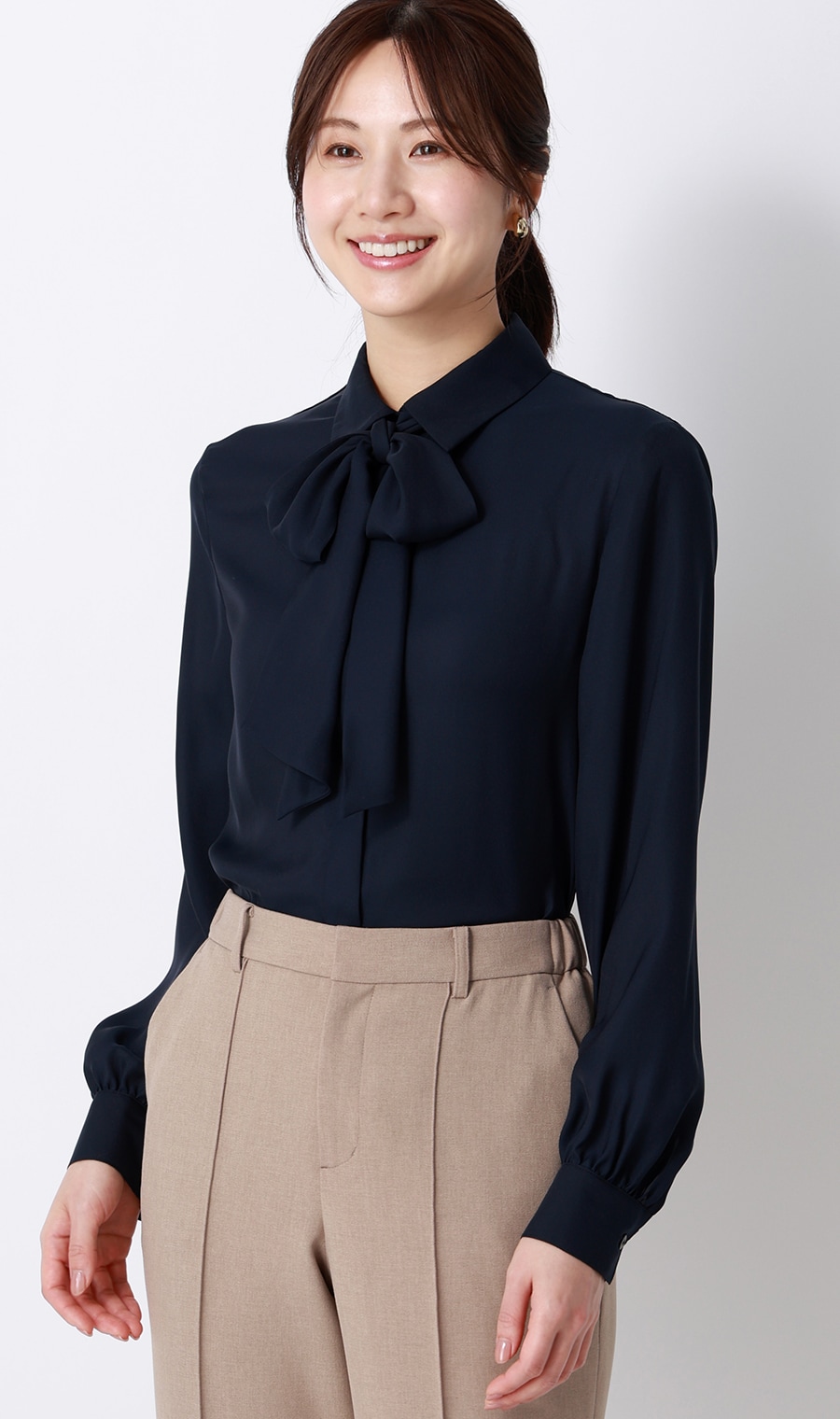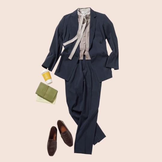 生地Camifu®を使ったネイビーのセットアップ。シアーなブラウンニットとブラウスで、柔らかなニュアンスコーディネートに。