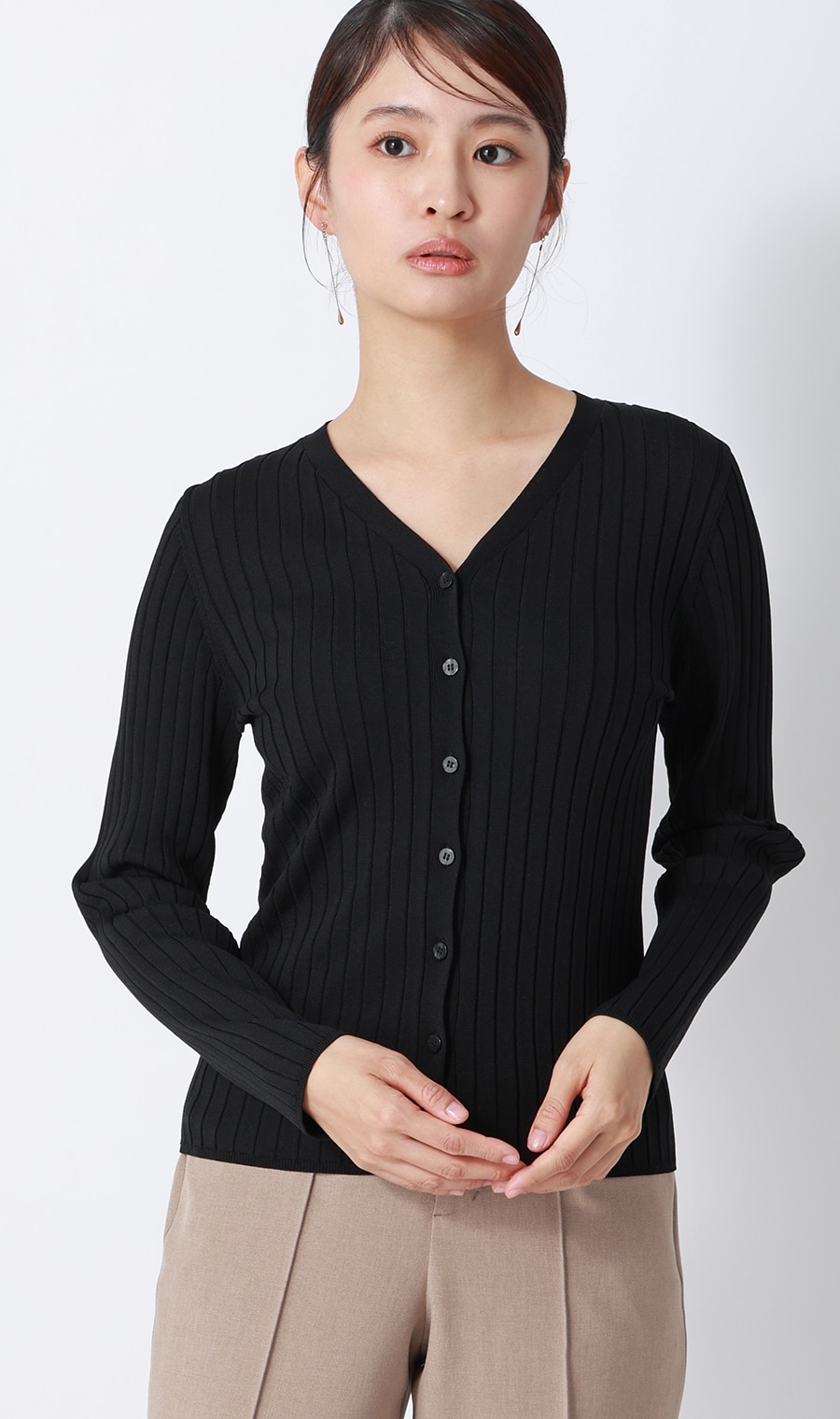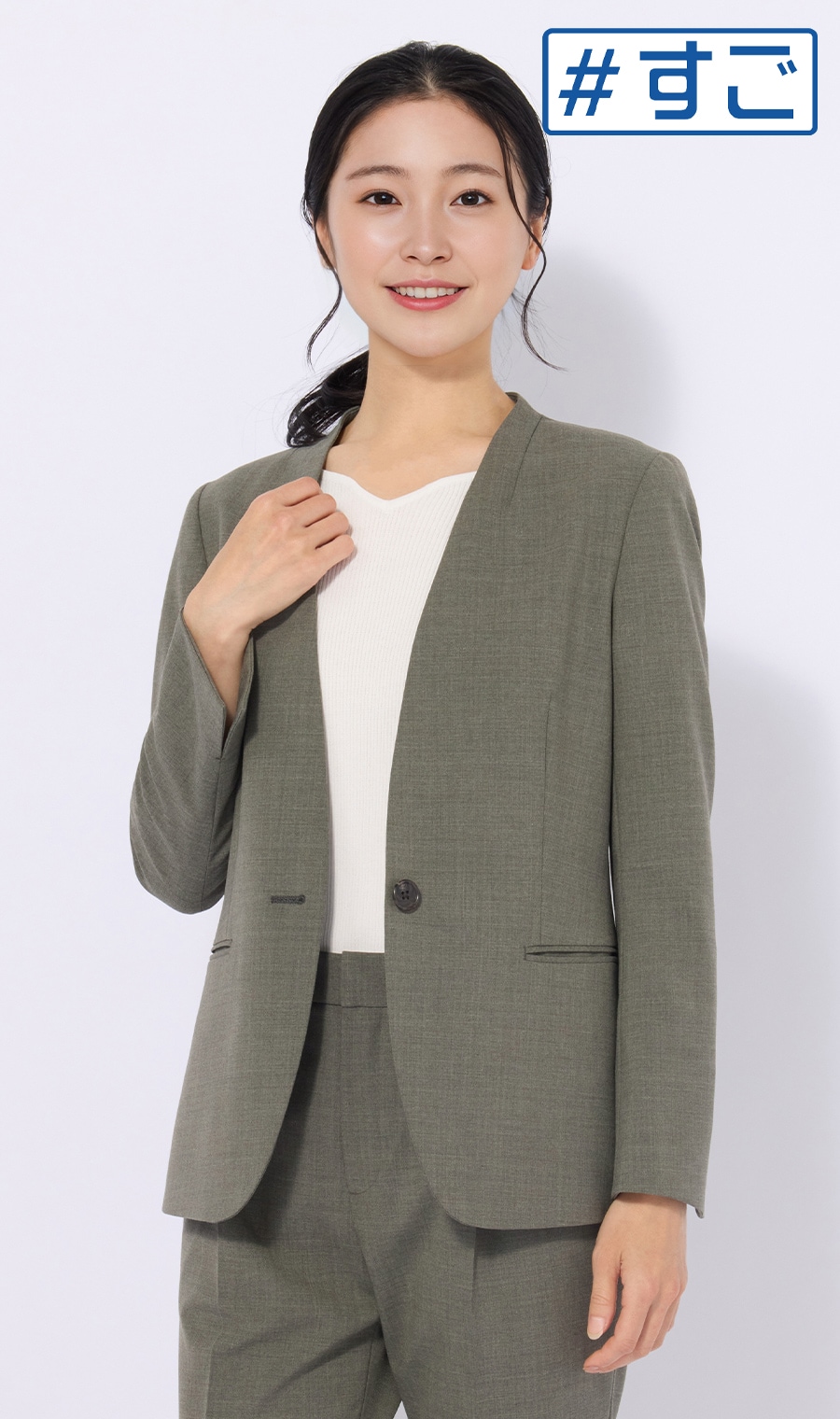大人気《#すご》シリーズの超ストレッチスーツに、新色ライトカーキが登場。すっきり見えが叶うVネックカーディガンで、上品な印象に。