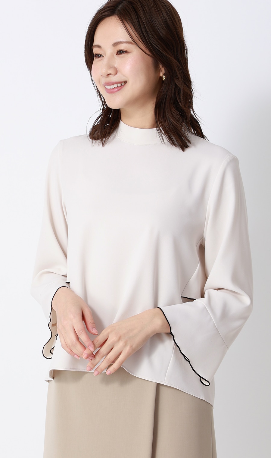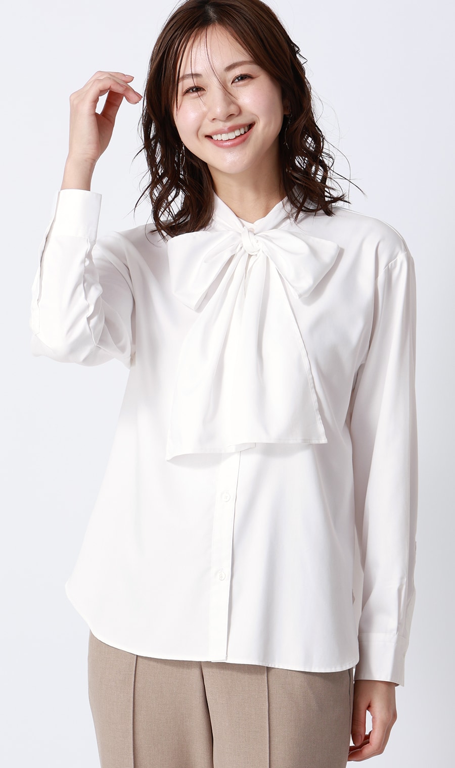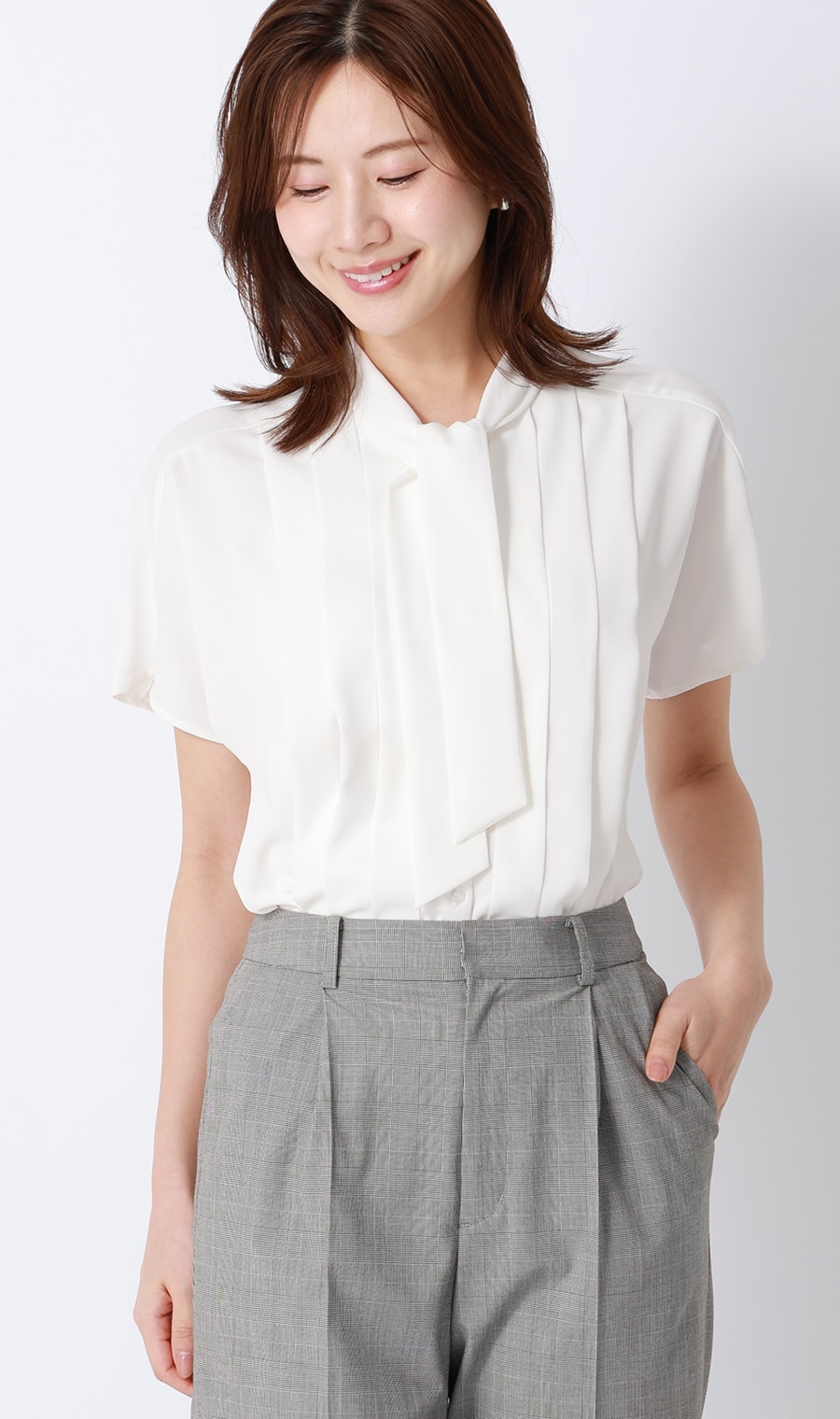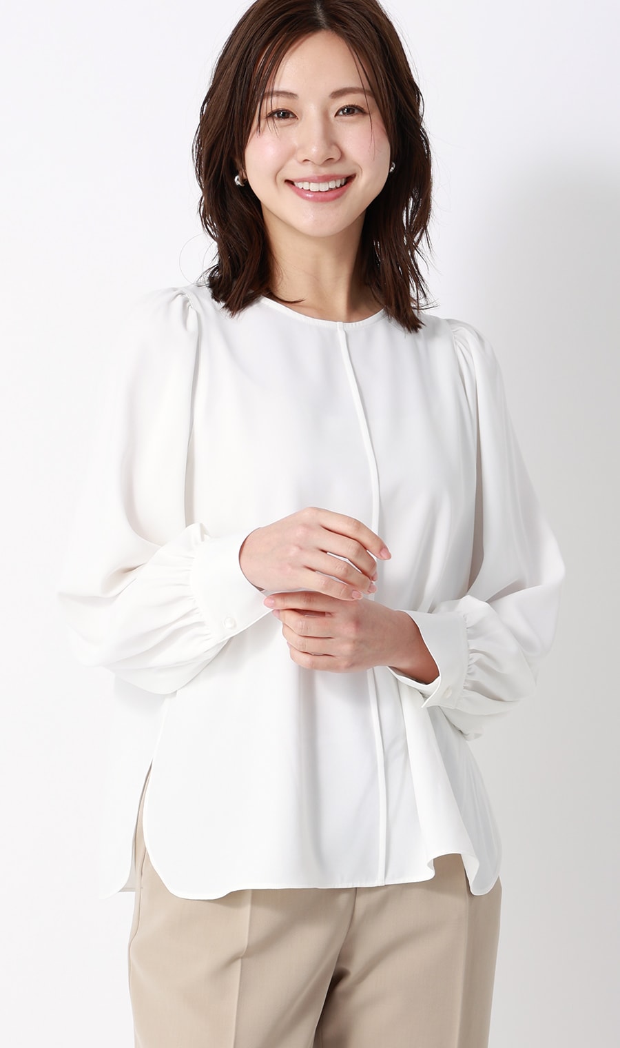 シアー素材の透け感が、重たくなりがちなオフィススタイルに、やわらかな抜け感をプラス。