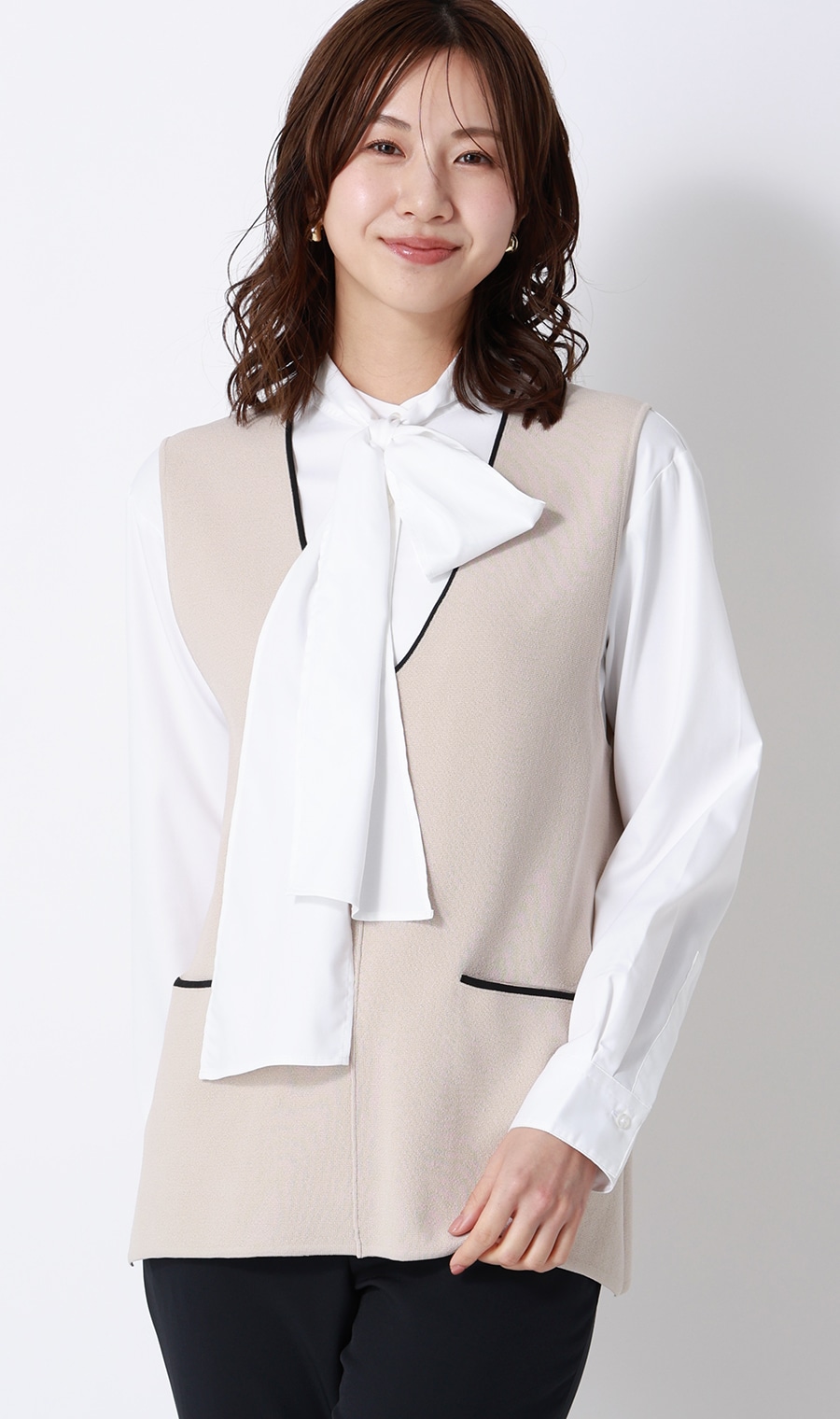 レイヤードで楽しめるニットジレです。リボンブラウスと合わせてオケージョンコーデや、ストライプシャツと合わせて通勤コーデなど、様々な着こなしに合わせやすいアイテム。