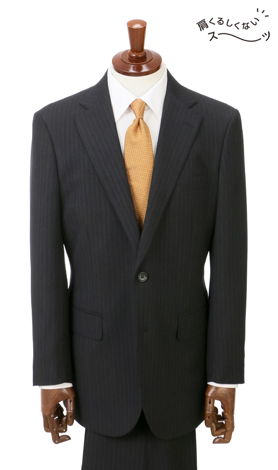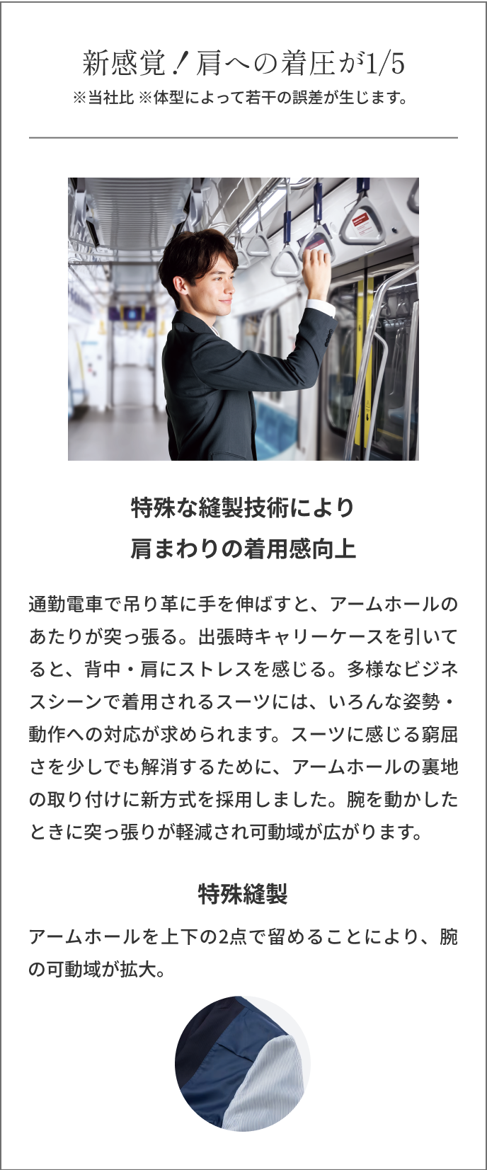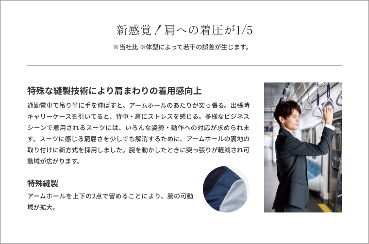 アームホールのあたりが突っ張る、背中や肩にストレスを感じる。スーツに感じる窮屈さを少しでも解消したい、そんな思いから開発。伸縮性のある生地を使い、日本人の体型に合わせて立体的に仕上げました。