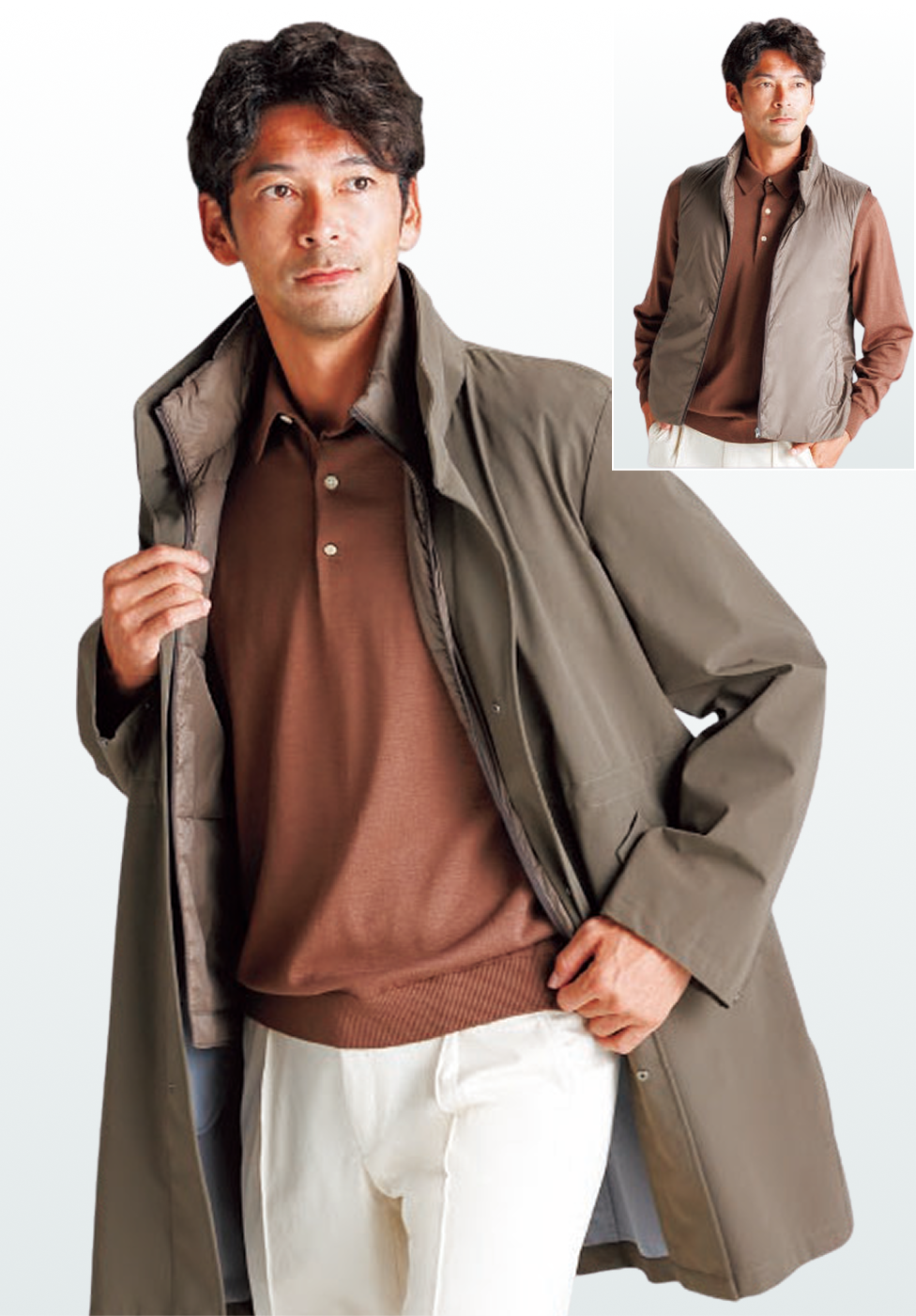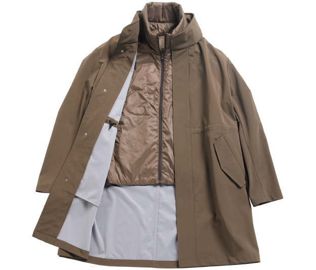 着脱可能なライナーベスト付きの3WAYコート。雨の日でも濡れにくく蒸れにくい快適な着心地を実現。中綿ベストはライナーの機能だけでなくベストとしても着用可能。