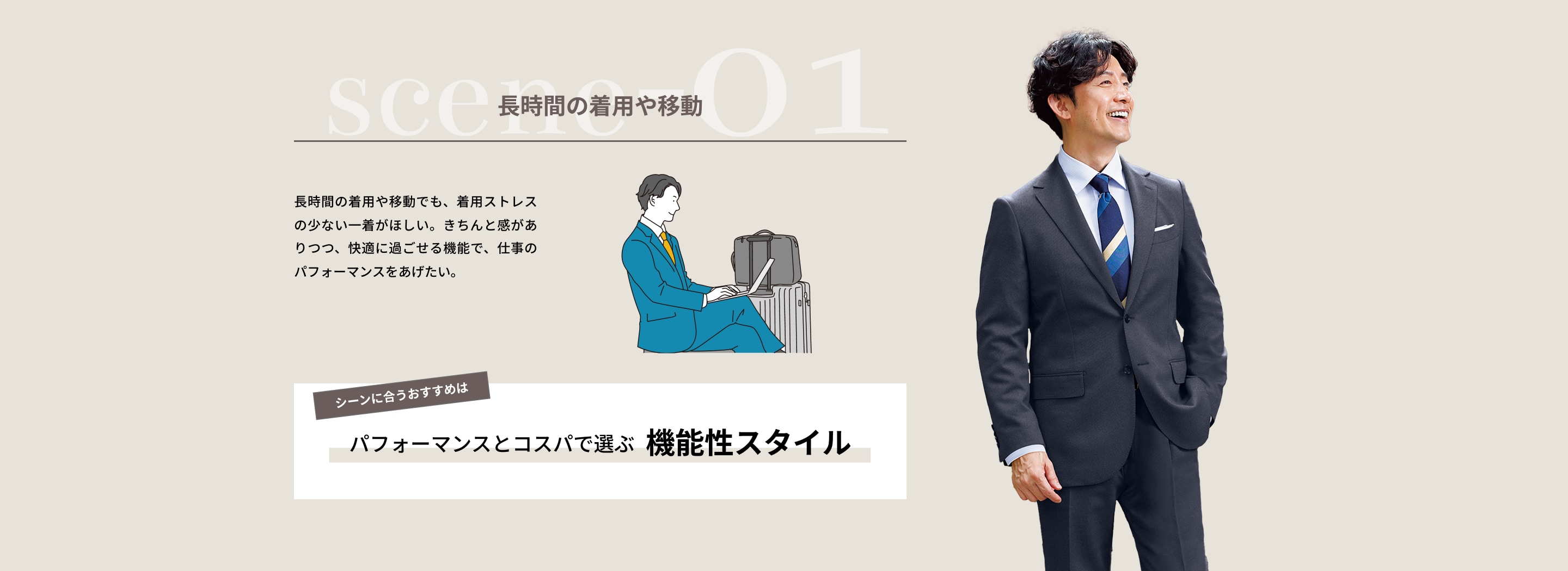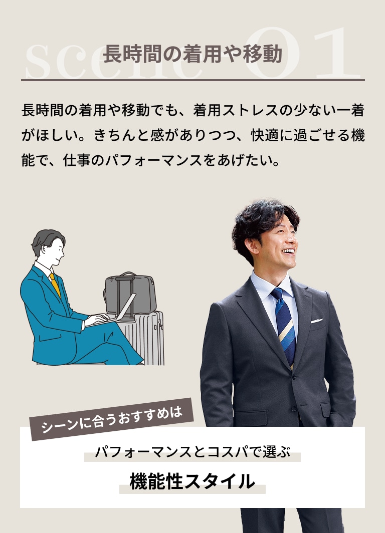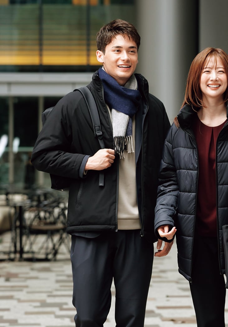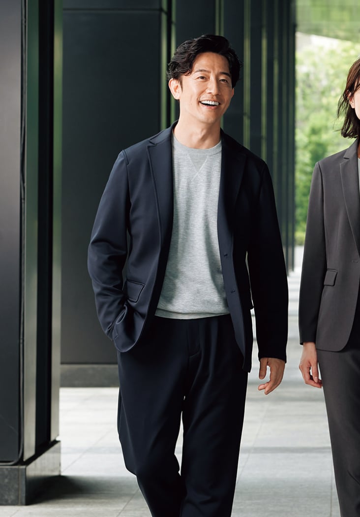 きちんと見えて、実はとことん快適。寒暖差に対応する調温・調湿機能や、動きやすいストレッチ素材など長時間の会議や移動でも疲れにくい仕事服で、働く毎日を快適にサポート。
