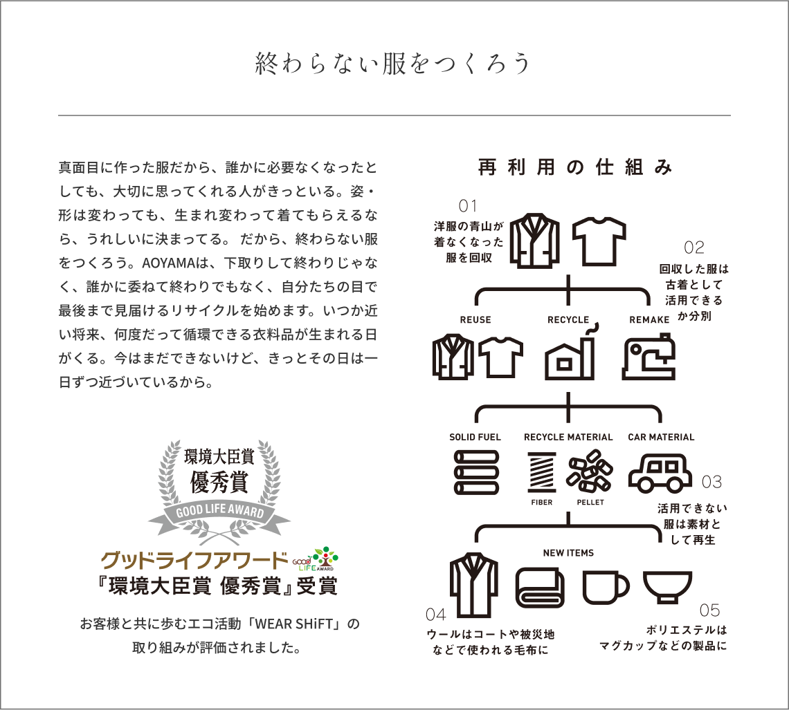 [WEAR SHIFT」によるリサイクルウールを混紡した素材を採用したサステナブルなスーツです。裏地や付属にもサステナブル原料を採用した環境に配慮した、まさに「繊維to繊維の循環リサイクル」を実現。