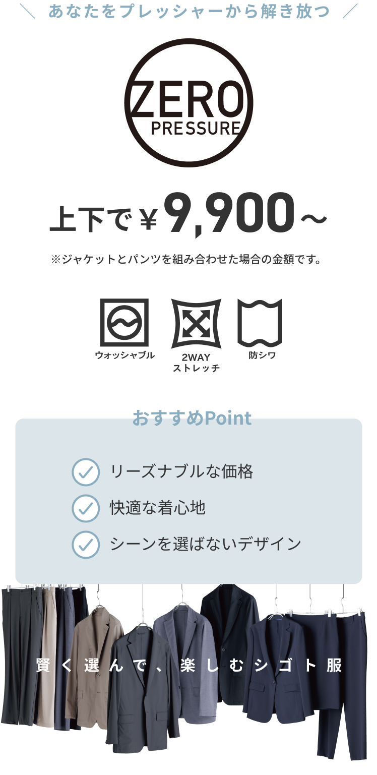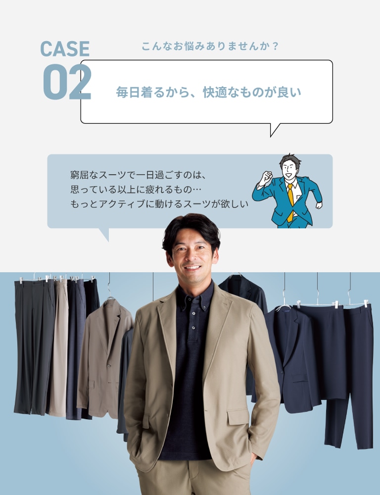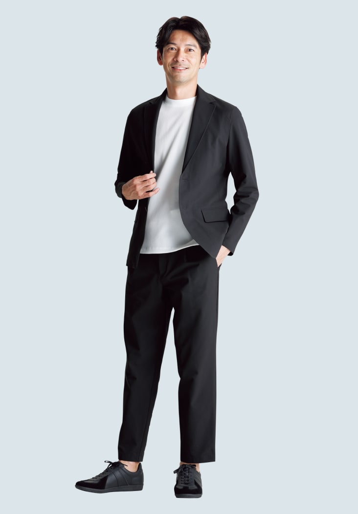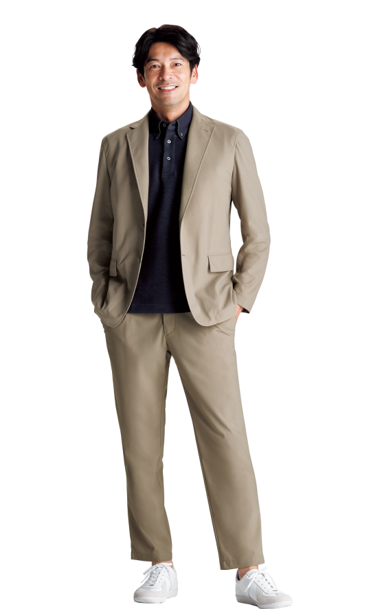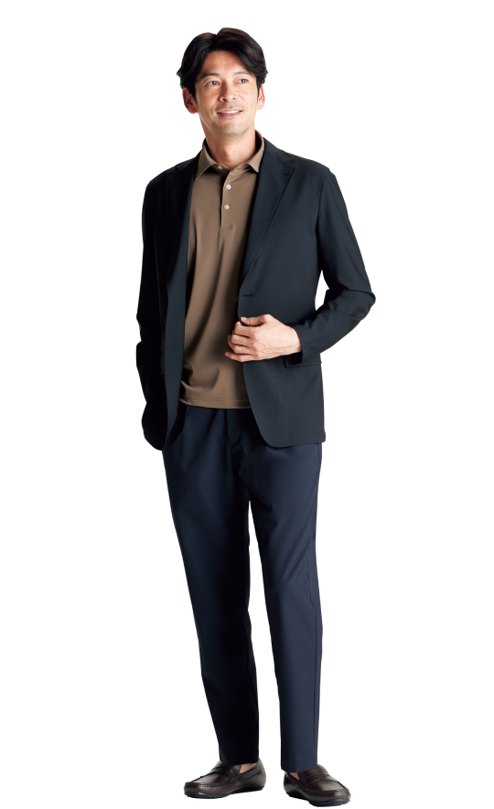タイドアップしたビジネススタイルから、カットソーやスニーカーを合わせたカジュアルスタイルまで気軽に着用できます。