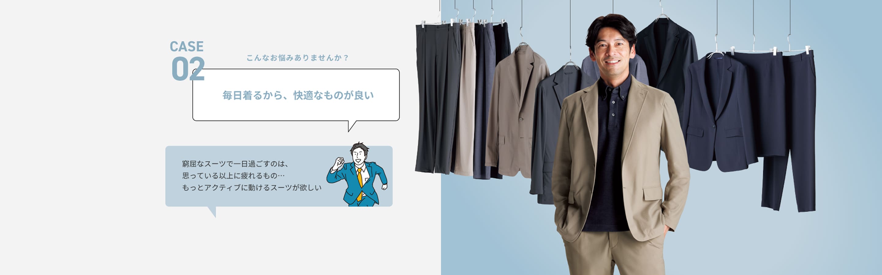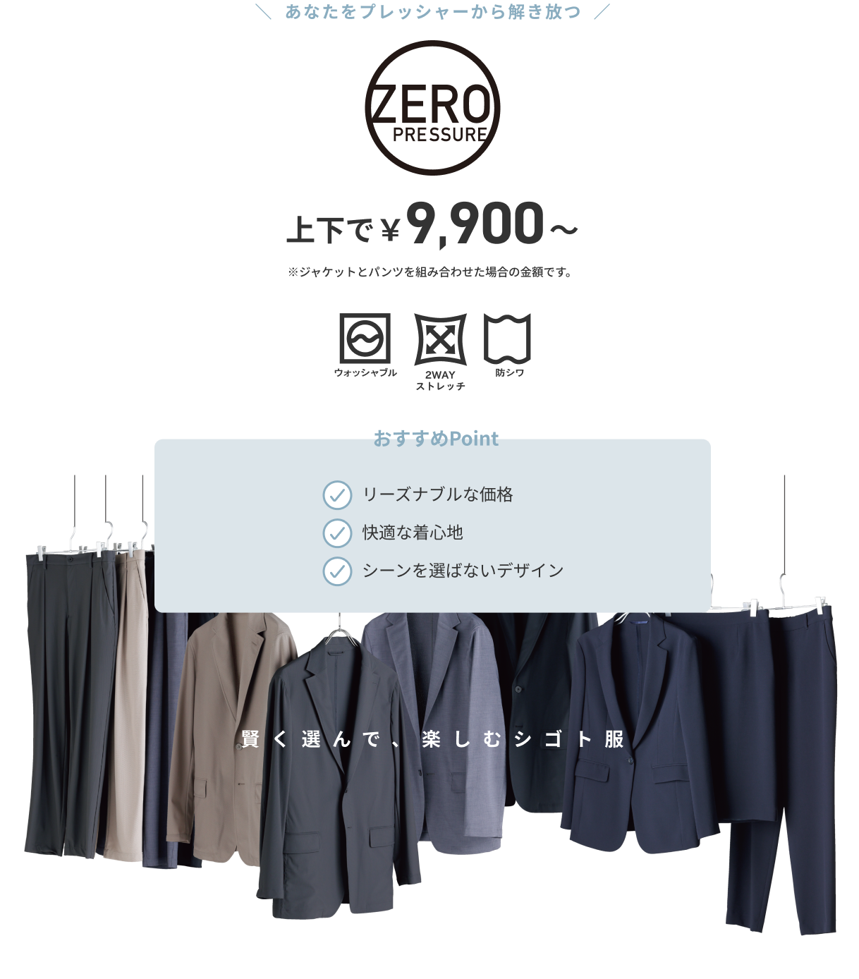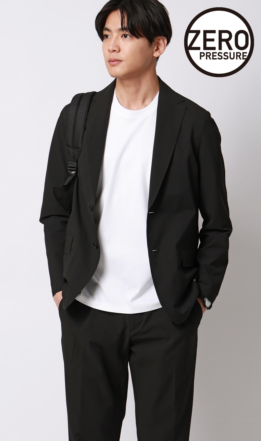 タイドアップしたビジネススタイルから、カットソーやスニーカーを合わせたカジュアルスタイルまで気軽に着用できます。