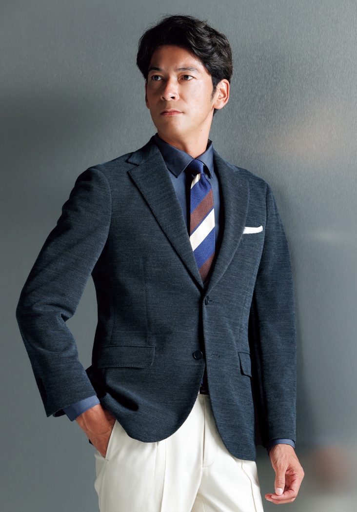 色味の明るいパンツを合わせることで、軽やかさをプラス。ジャケットの美しいシルエットが、大人の余裕と品格を引き立てます。カジュアル感を保ちつつも、上質さをしっかり感じさせるスタイルです。