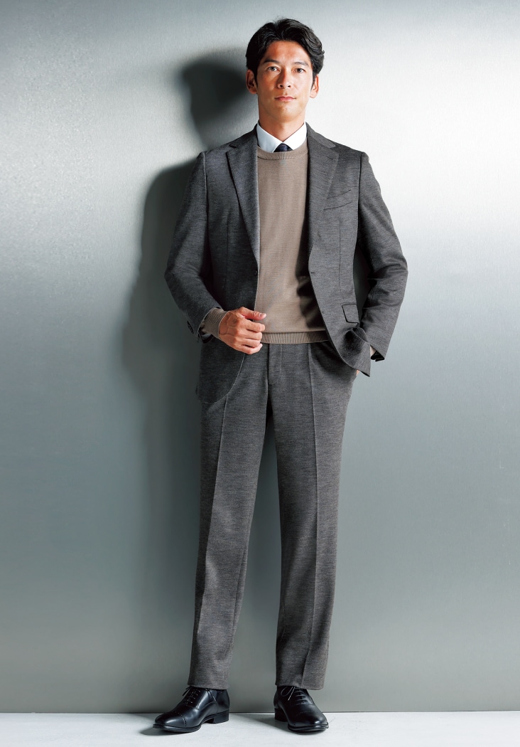 シックなグレースーツをベースに、ニュアンスカラーのニットを合わせることで落ち着いたトーンに、ほどよい温もりとやわらかさが加わり、都会的な洗練を際立たせます。きちんと感をキープしながらも、どこか余裕を感じさせる大人スタイル。