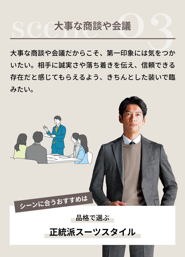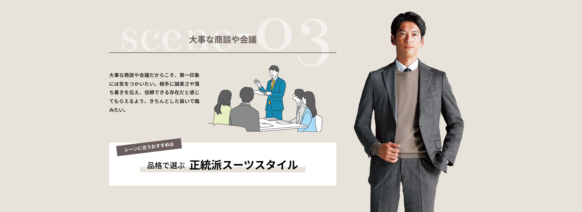 相手に与える印象が重要になるビジネスシーンにはスーツできちんとした着こなしに。スーツとは、上着とパンツを共生地で仕立てた上下揃った衣服です。えりに芯が入ったシャツにネクタイを締めて革靴を履くことで、多くの場に対応できるカチッとした印象になります。