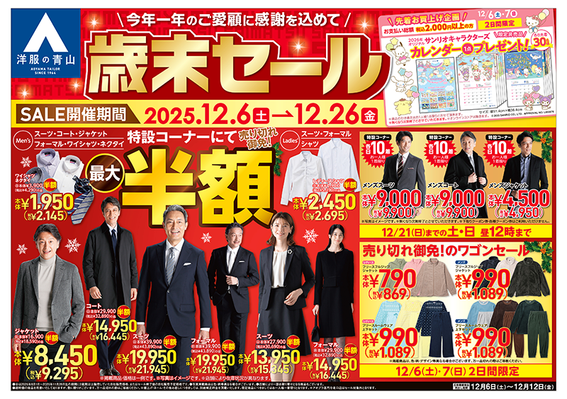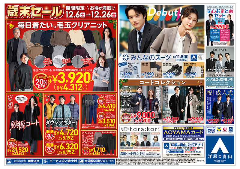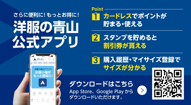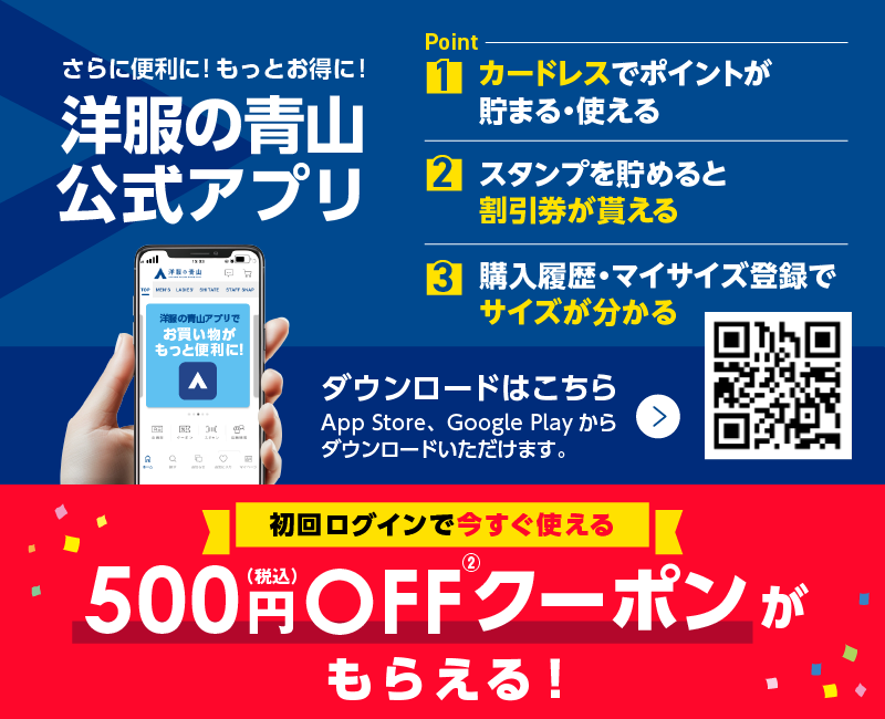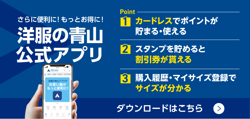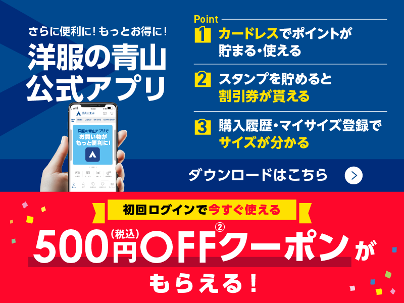●1点¥3,190(税込)以上の商品をお買上げの際に1枚のみご利用いただけます。 ●全国の洋服の青山店舗でご利用いただけます。 ●オンラインストアではご利用いただけません。 ●1回の会計で複数端末のクーポンはご利用いただけません。 ●下取り・各種クーポン券・一部セットセールとの併用は出来ません。 ●数量限定・福袋・オーダー、企業・団体ユニフォーム商品ならびに一部の学校制服は除きます。 ●詳しくは店舗スタッフまでお問い合わせください。