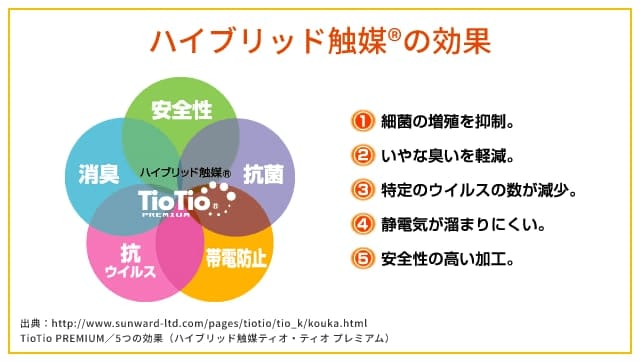ハイブリッド触媒®の効果 1.細菌の増殖を抑制。 2.いやな臭いを軽減。 3.特定のウイルスの数が減少。 4.静電気が溜まりにくい。 5.安全性の高い加工。