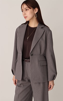 きちんと感は残しつつ、スタイルアップして見えるウエストシェイプと華やかなボリューム袖がポイントのジャケット。